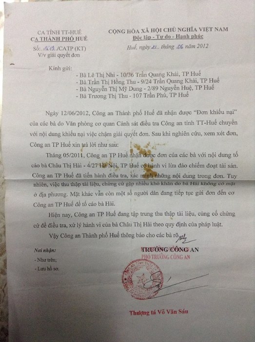 Công văn giải đáp của công an TP. Công an đang giao hội thu thập tài liệu. H. Chúng tôi liên tục gửi đơn và được biết Châu Thị Hải đã đến làm việc với công an. Hải cũng đã dìm có cướp đoạt tài sản của chúng tôi. Sống tại ngôi nhà ở 4/27 đường Hà Nội. Huế không có một văn bản chính thức nào để đáp giải quyết vụ việc.